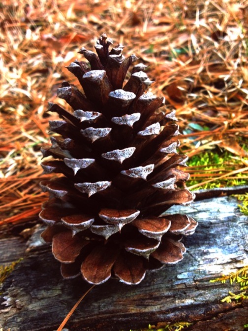 I find a sort of beauty in the asymmetrical radial lines of the pine cone against the horizontal wood grain.