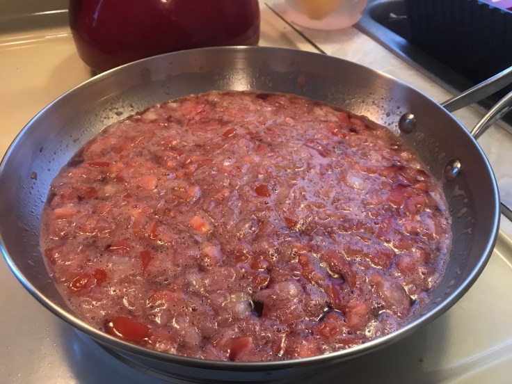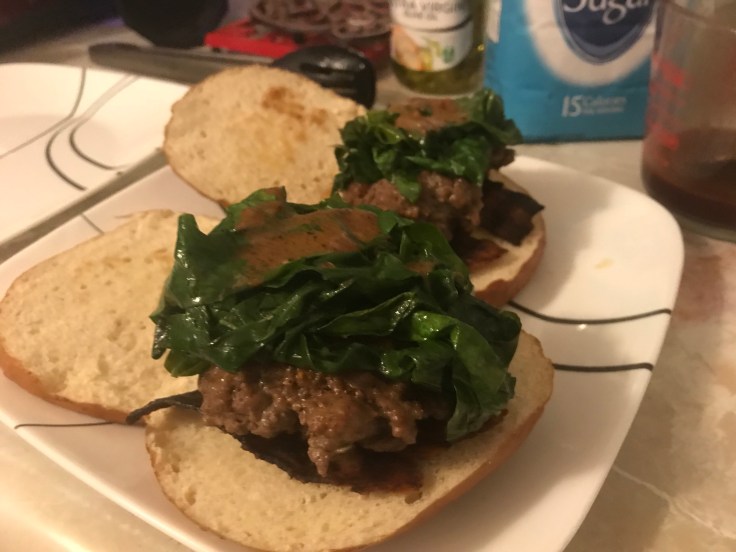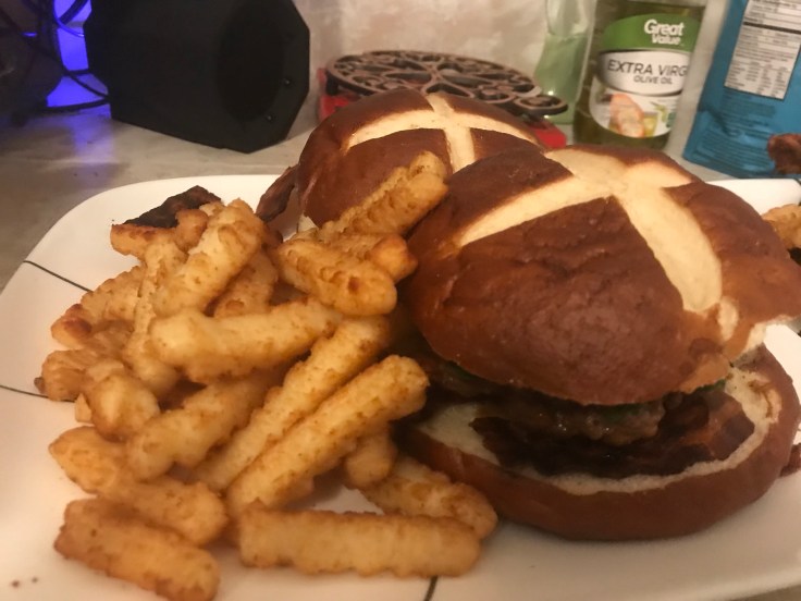 About the Burger– The “Bleu By You” burger contains diced bleu cheese and is served with Swiss chard and a reduction of onions, garlic, Roma tomatoes, and red wine red grape juice. The reduction didn’t work as planned, possibly due to my substitution (I’ll have to research better non-alcoholic substitutes for red wine for future burgers anyway). I chose to serve the burger on a pretzel-style bun.