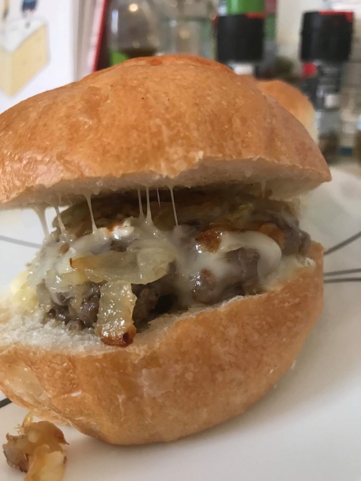 This burger was seasoned with Worcestershire, salt, and pepper and stuffed with Brie cheese, almost like a juicy Lucy. It was grilled and then topped with more Brie and caramelized onions and served on a French roll (of course!).