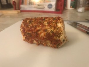 The show called for feta cheese, but I found a tomato-garlic semi-soft chèvre goat cheese that I just couldn’t pass up.
