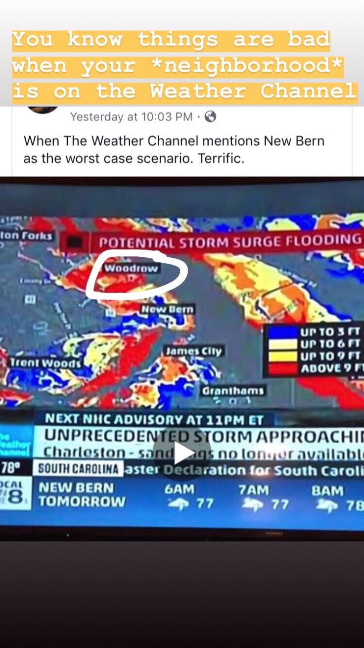 Florence is a huge storm. We’re still going to get high winds and inundated with rain. They’re still predicting a storm surge of anywhere from 9-13 feet in our town. There will be flooding and downed trees and power outages. Even with the downgrade, the winds could destroy roofs and mobile homes.