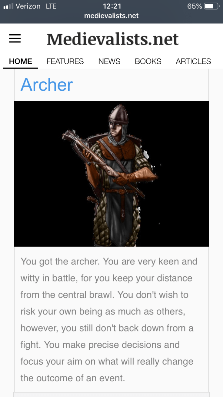 Sometime this week I also took a quiz on medievalists.net to see what battle position I’d be in the medieval period. To the surprise of nobody, I’m an archer.