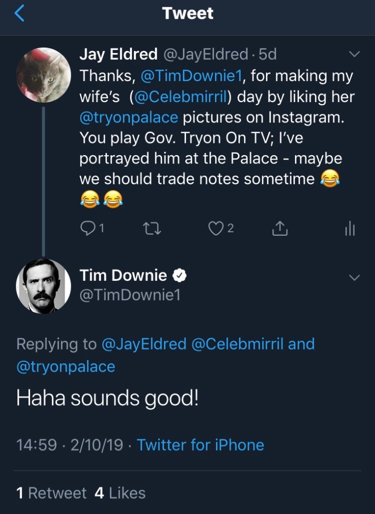 Some of you might be familiar with the Outlander series. If you’ve read the books, you know the characters visit North Carolina and encounter Governor William Tryon. If you follow the television series, you might know Tryon will be played by Tim Downie. And if you’ve read this blog for any amount of time, you know my wife works at Tryon Palace, where I’ve portrayed my cousin, William Tryon. Well, this week all of that collided into one glorious twitter thread:
