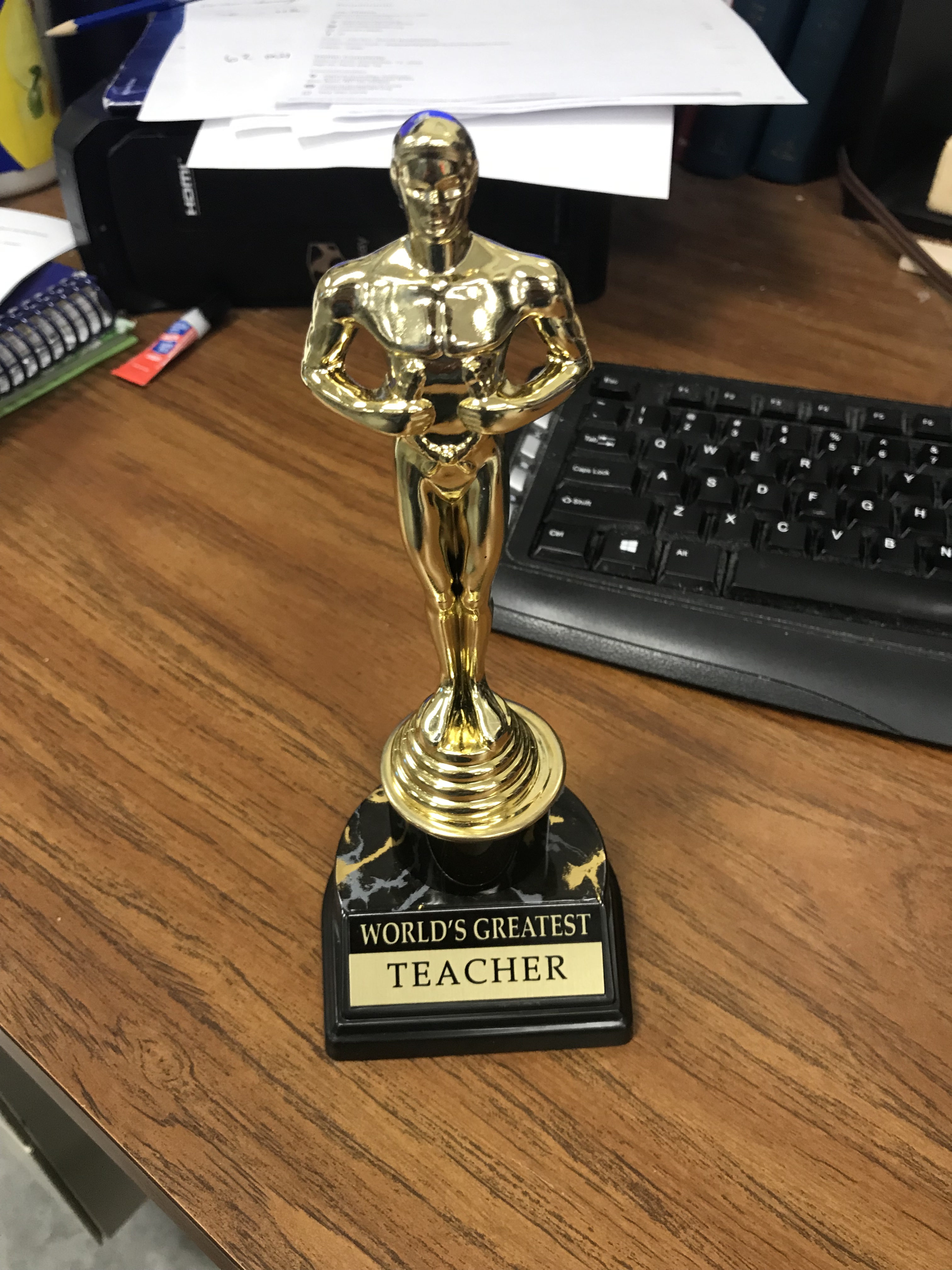 Way back in April, the seniors went on their senior trip to Orlando, Florida. One of them brought me back my very own Oscar statuette! Of course, as a huge Office fan, I’m calling it my “Dundee”.