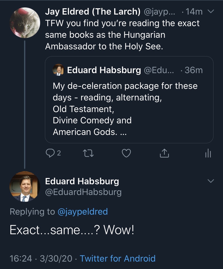 Someone please tell me what kind of timeline I’m traveling in that I get to have interactions with Eduard von Hapsburg?