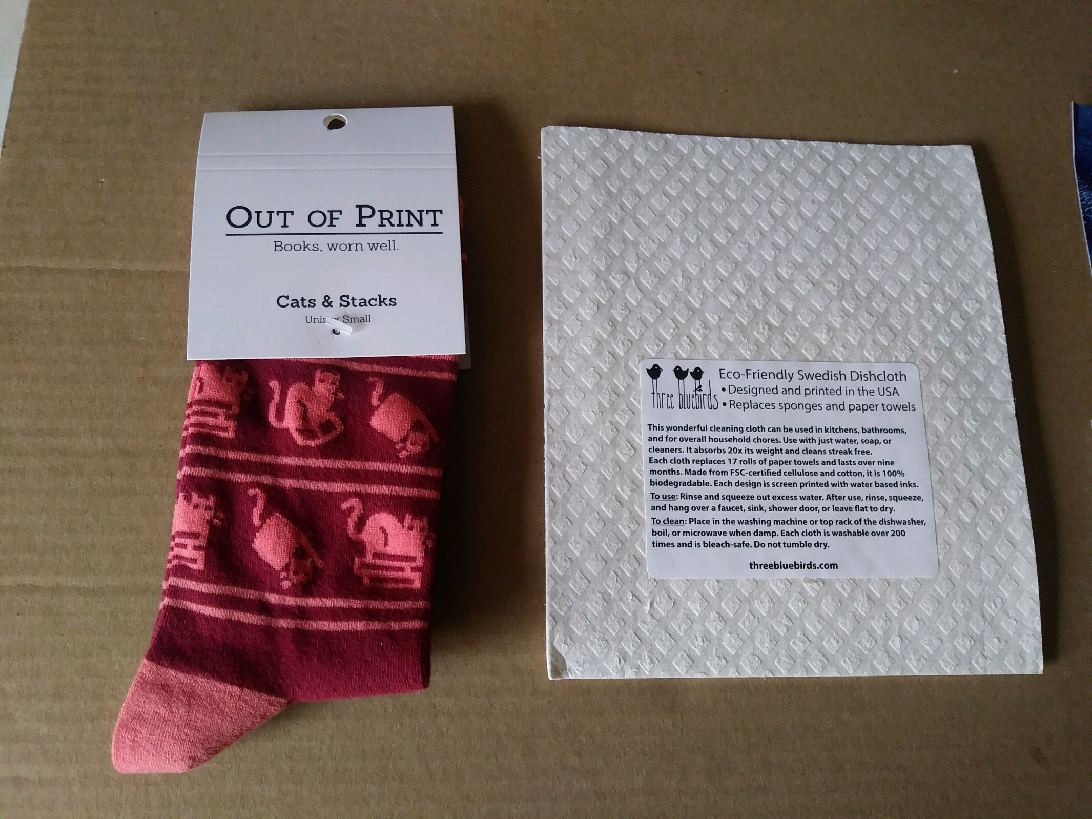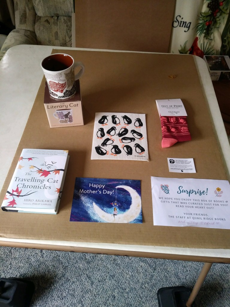 Yesterday, the package arrived: it had a cat-themed mug, fuzzy cat socks, a book โThe Traveling Cat Chroniclesโ, and a reusable penguin print cleaning cloth.