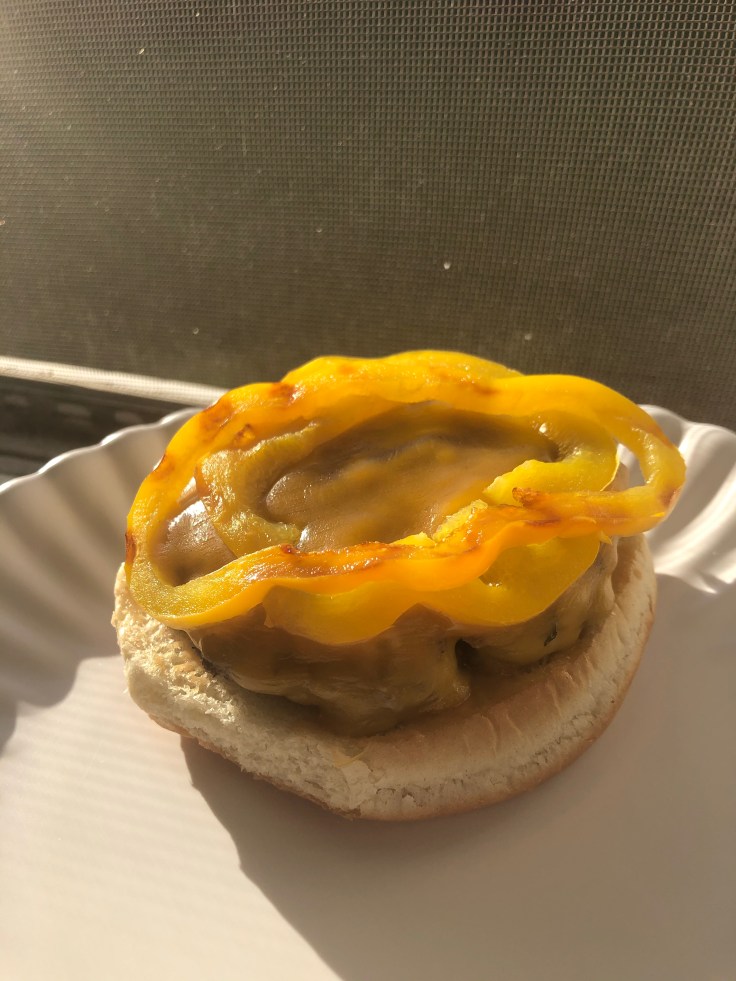 - With about a minute remaining, melt the cheese on each patty, also topping each patty with two rings of pepper.