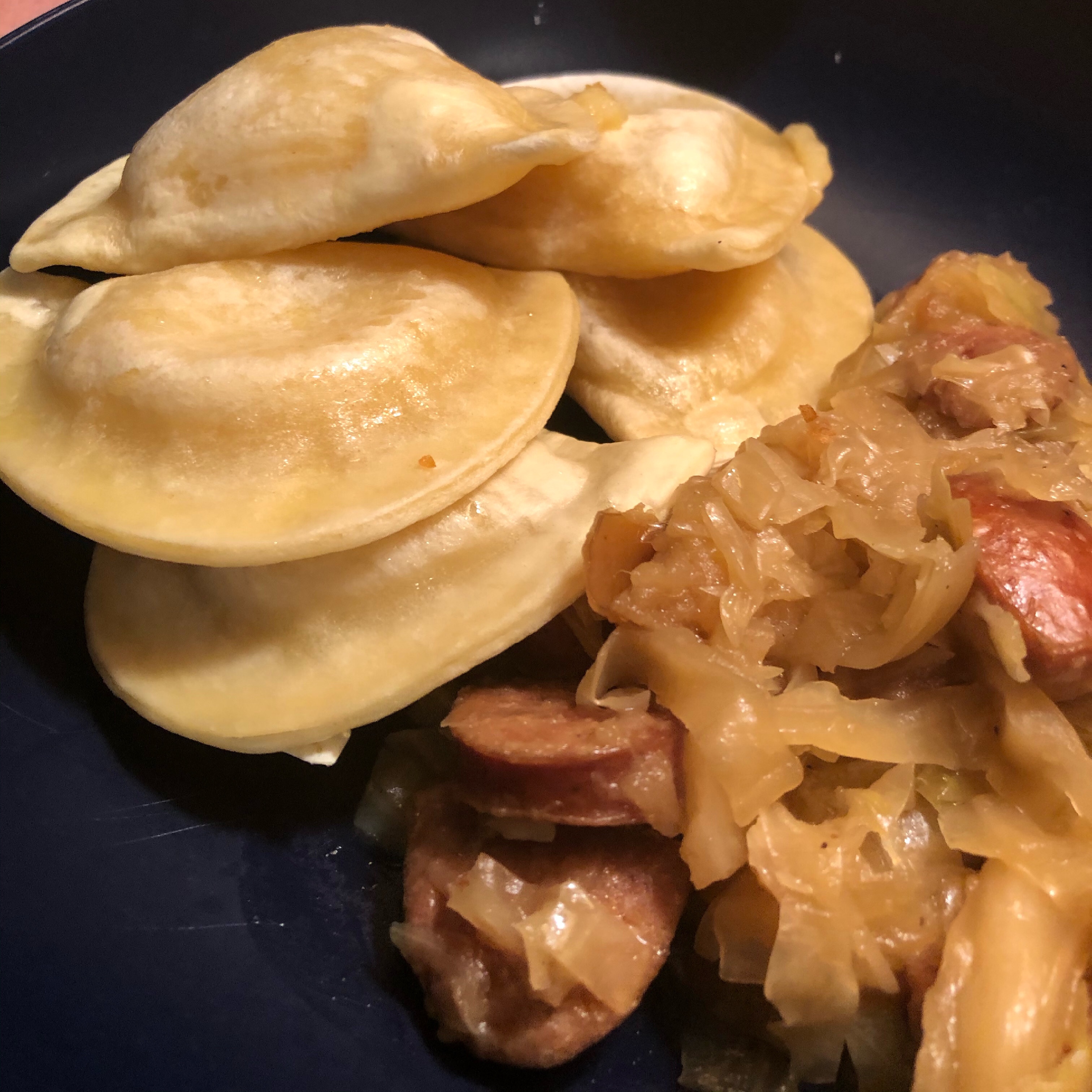 The pierogi with cabbage was an easy dish I whipped up on a rainy Sunday. I poured a cup of chicken stock in my crock pot along with a head of cabbage and a pound of chicken-apple kielbasa. I Then I added a thinly sliced onion, two wedged apples, and some spices and let it cook on low for six hours. It was so good and melt-in-your-mouth that Krystal said she could eat just that and leave the pierogi alone.