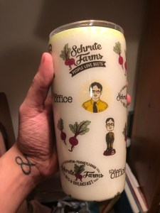 And just this last weekend I received a wonderful gift from a good friend: a Schrute Farms tumbler which I’m going to use in my workspace for water.