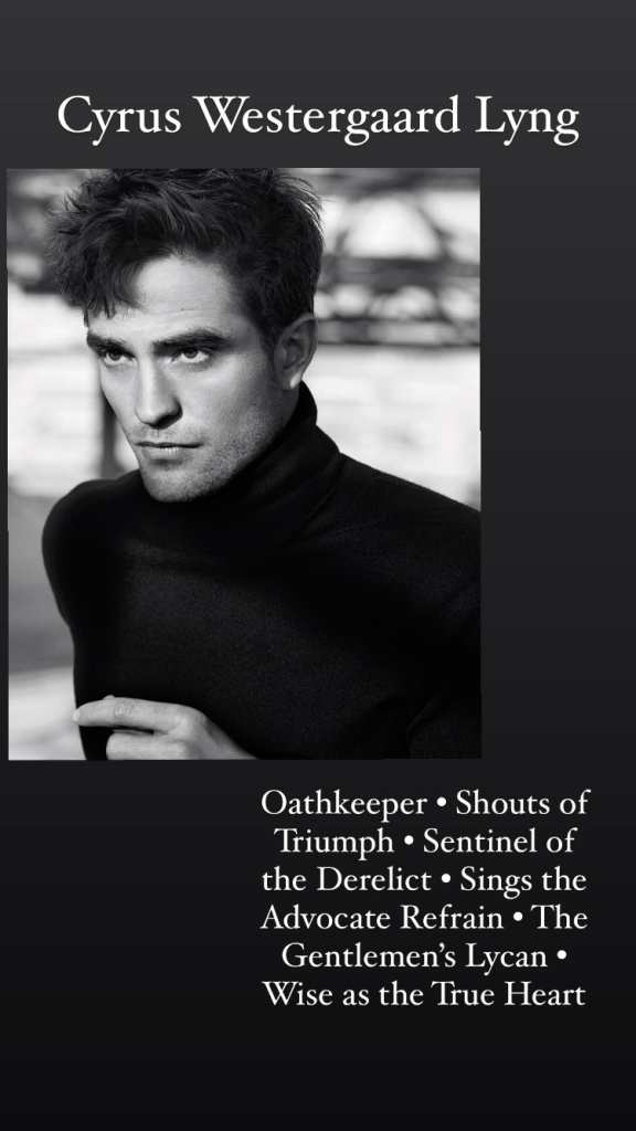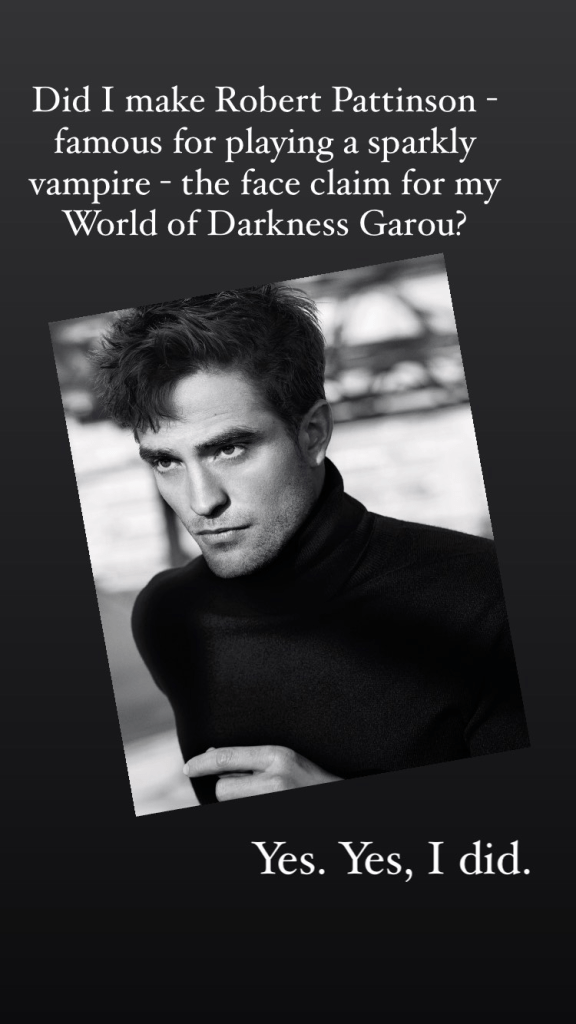 Cyrus, my werewolf in World of Darkness had two big-for-him (and for me) moments. First, he attained new deed names along with his friend/acquaintance Ollie, and was recognized officially as rank Fostern. Second, he spoke in front of the JusticarCouncil in defense of Prince Hastings of New Orleans – and he spoke well. I was very nervous RPingwith many more experienced players, but I was told I did a good job.