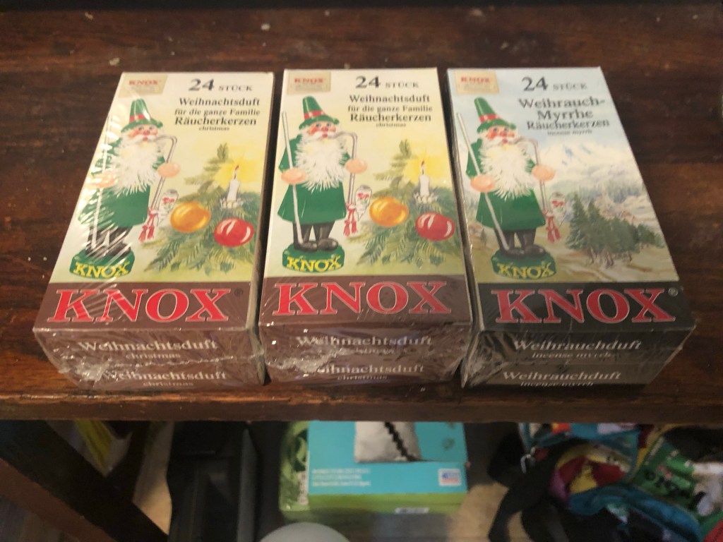 Then, my friend Becky let me know that Tuesday Morning had cones for my Raucherhutte. She picked said she was picking me up two packs of “Christmas” and one pack of “Myrrh”, sending me a picture of the price tag so I knew what I would owe. When I picked them up, however, there was a surprise:
