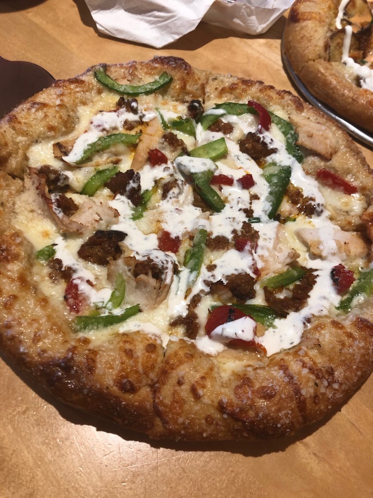 Take the trip less travelled. Starts with an herb aioli base layered with chicken, Italian sausage, garlic roasted red peppers, green bell peppers, mozzarella, Wisconsin aged white cheddar, and finished with an herb aioli drizzle.