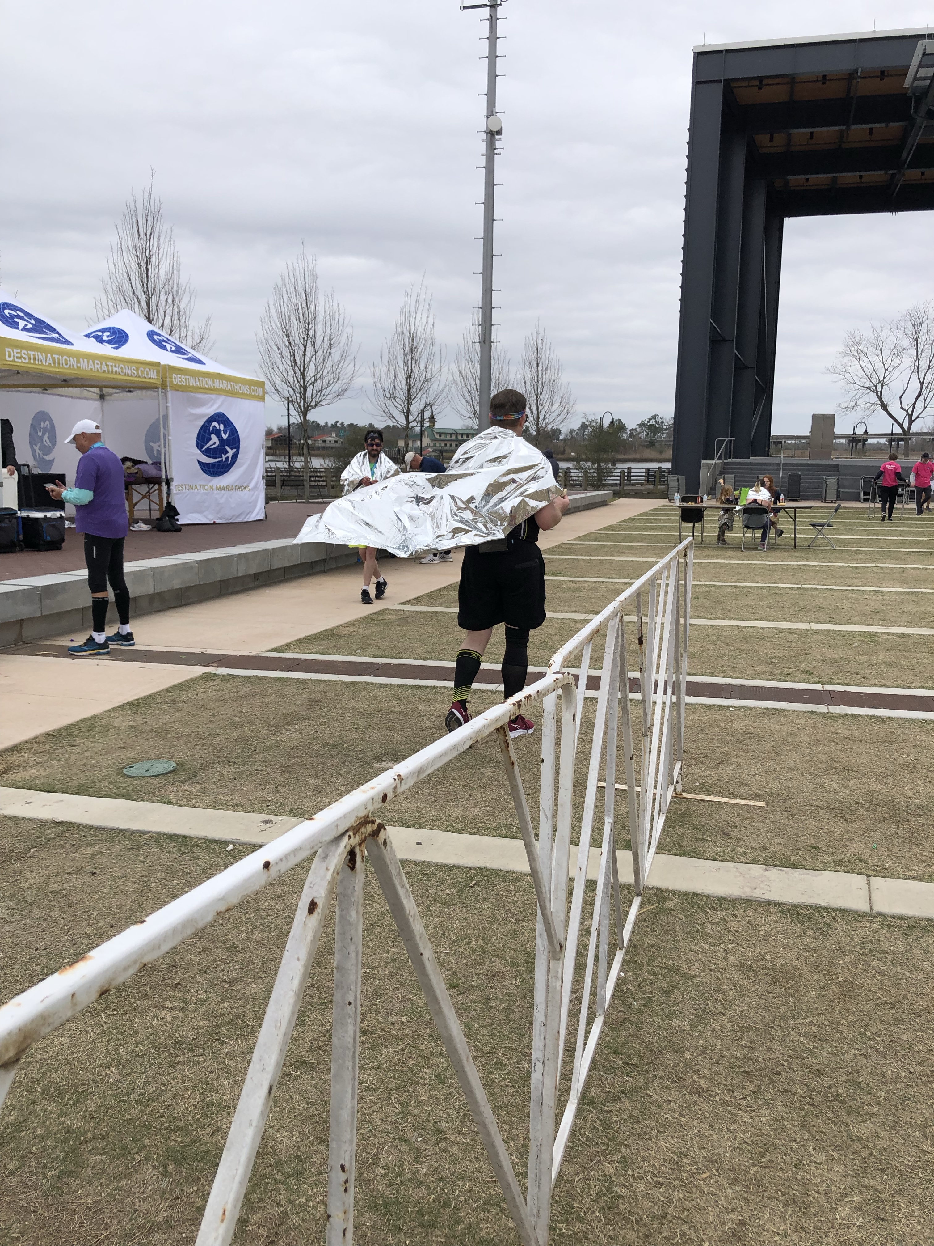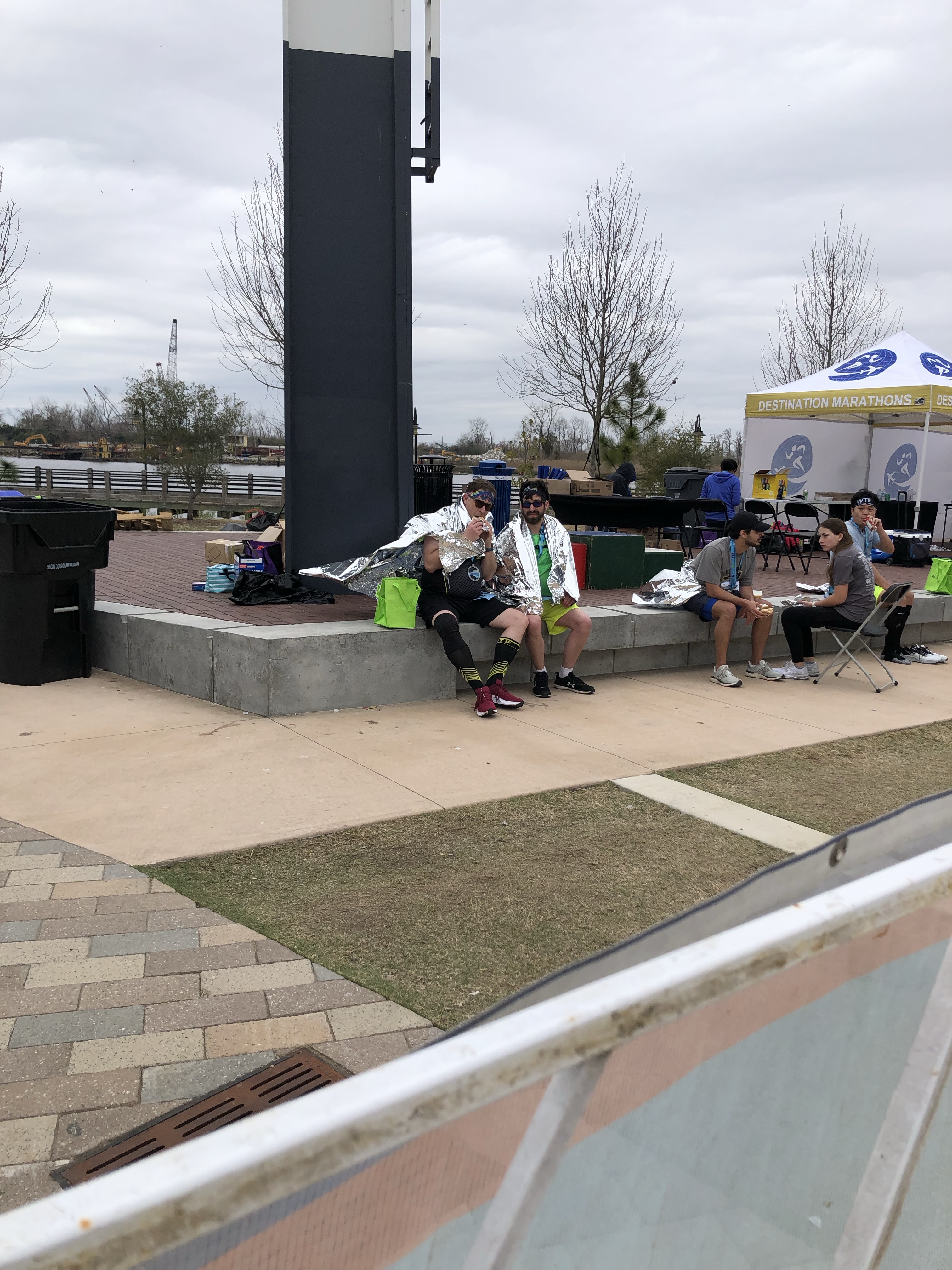We went back to the hotel for a relaxing evening watching The Office before waking up at 4:45 so Denise could drive us to the start before roads started getting shut down. We found a spot away from the wind and passed the time talking to some folks running the half marathon.