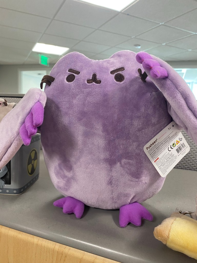 My cubicle at work is known for Pusheen. Where others have plants, I have 26 Pusheen stuffies, ranging in size from keychains to a large dragon, along with a large “Pizza Pusheen” vinyl pop figure. On the wall are two keychains, one 3D-printed Pusheen, and 3 enamel pins – one of these pins helps hold up my Pusheen calendar on which important days are marked by Pusheen stickers. Pusheen magnet kits decorate my file cabinet, I have Pusheen logos in my nameplate holder, and I wear a Pusheen lanyard with my work badge on it.