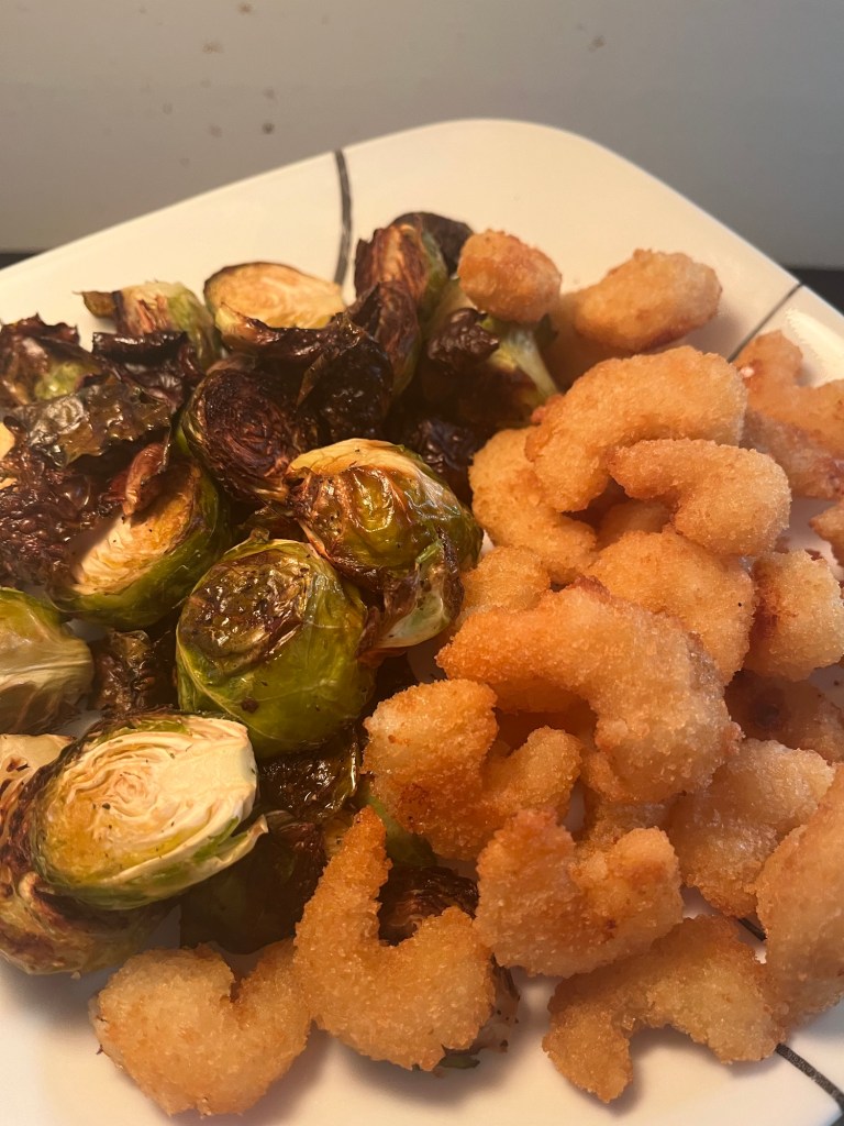 Supper Wednesday was roasted Brussels sprouts and popcorn shrimp.