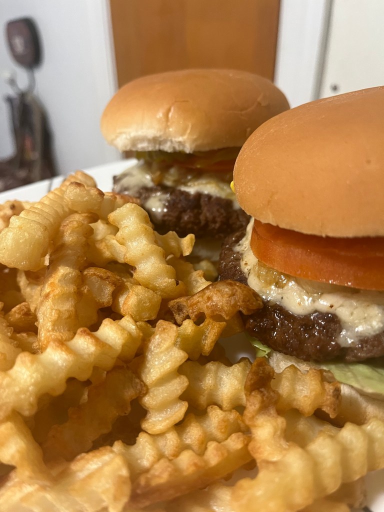 Today I slept restlessly as my back decided today would be a bad-back-day. But I was able to make the supper I had planned, which was pub-style burgers: seasoned beef patties perfectly grilled and topped with whiskey-infused cheese and caramelized onions on a bun with mayo, lettuce, tomato, pickles, and mustard.