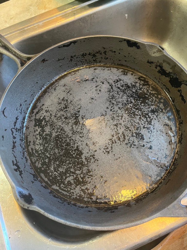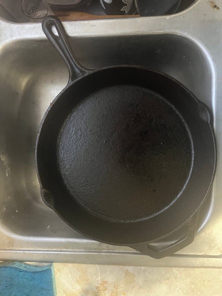 Three hours baking in the oven with three coats of oil followed by an overnight cooldown and this is the result. Thereโs some spots where Iโm going to have to watch for flaking, but I think itโs ready for use – I canโt wait to see this after a couple months with some natural seasoning built up!