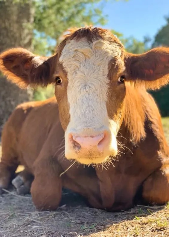 Image: Houdini the Cow resides at the St Louis Gentle Barn. In this photo, he is in a recumbent pose on the ground. He is large and brown with a white patch along his face between his eyes and stretching down toward his pink nose. A single piece of hay or straw sticks out of his mouth. He looks toward the camera with a peaceful gaze.