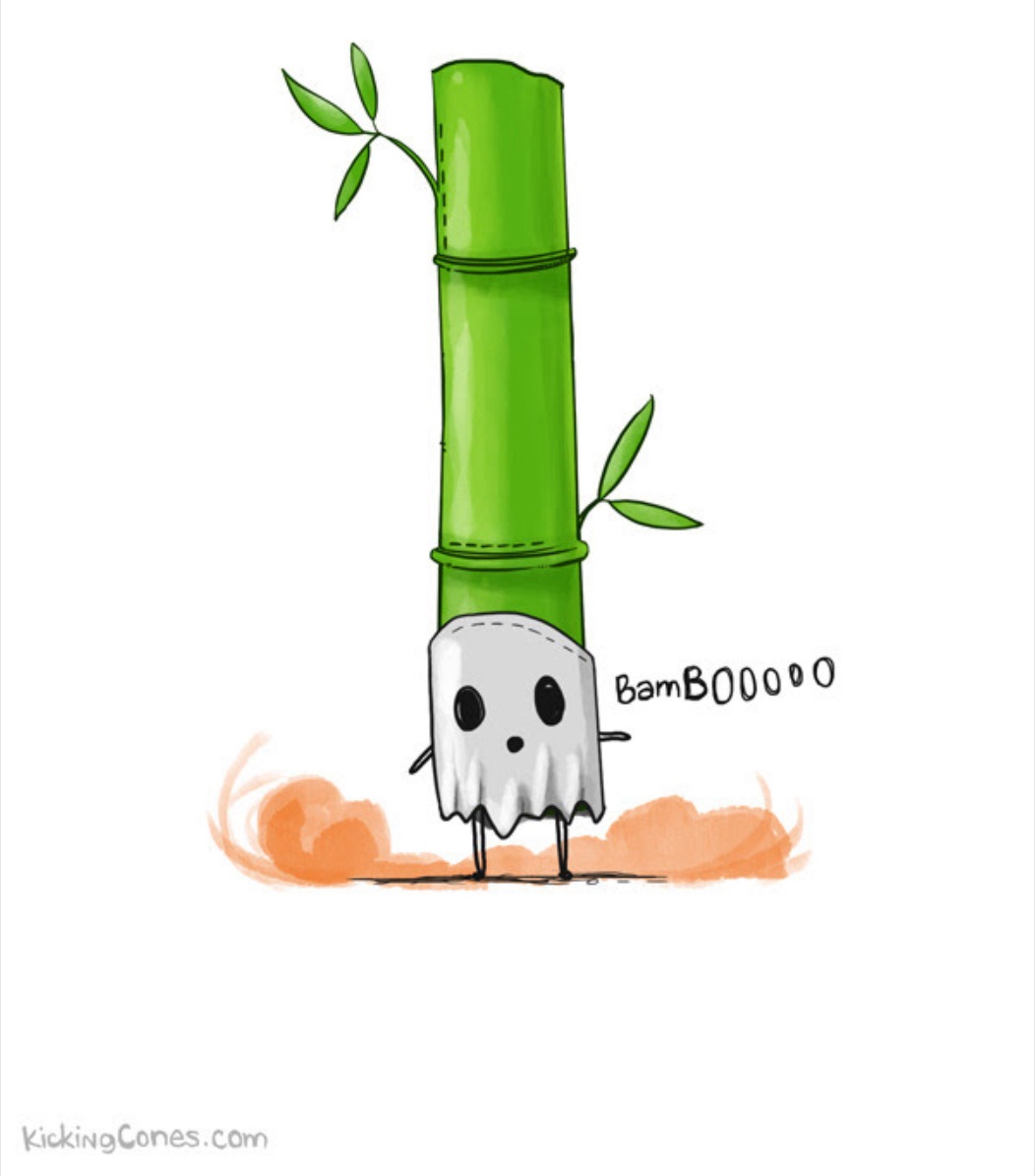 Image: bamboo shoot wearing a ghost mask as if for Halloween labeled “BamBOOOOO”. The cartoon is from KickingCones.com