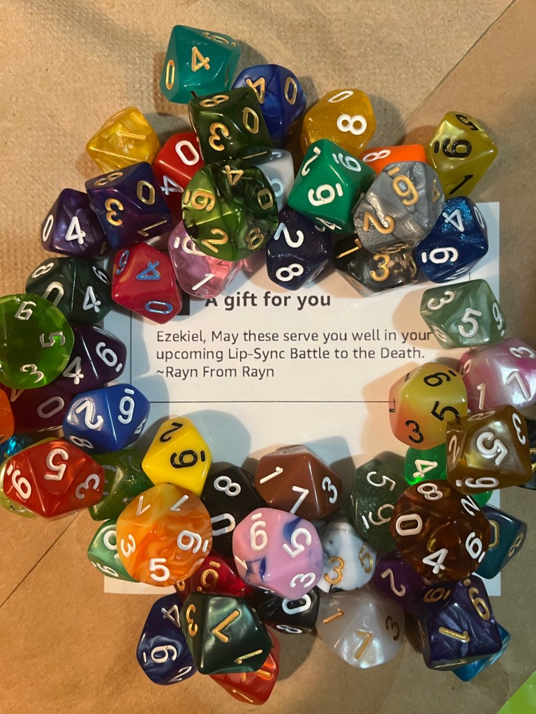 My character is the one involved in the lip sync battle, and one of my fellow players sent me a package of 55 ten-sided dice to aid me in my quest.
