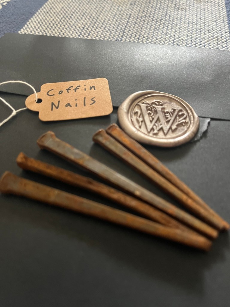 We went downtown and saw my brother in law Pat’s office in the court house (he’s associated with the district attorney) and walked Main Street and Julia and I enjoyed some coffee and I found a small bottle of coffin nails in a curiosity shop. I know the likelihood of them being used in a real coffin are astronomically low and the name itself refers to the shape but I still liked them and wanted to support the small business.
