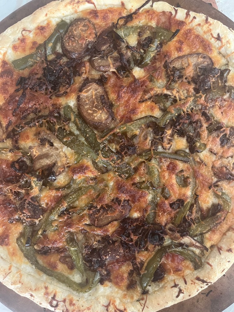 Saturday I alternated between cleaning and reading and for supper I made pizza: homemade crust and white sauce with sautéed onion, green peppers, and mushrooms and bacon. For dessert I had a small individual serving of chocolate ice cream.