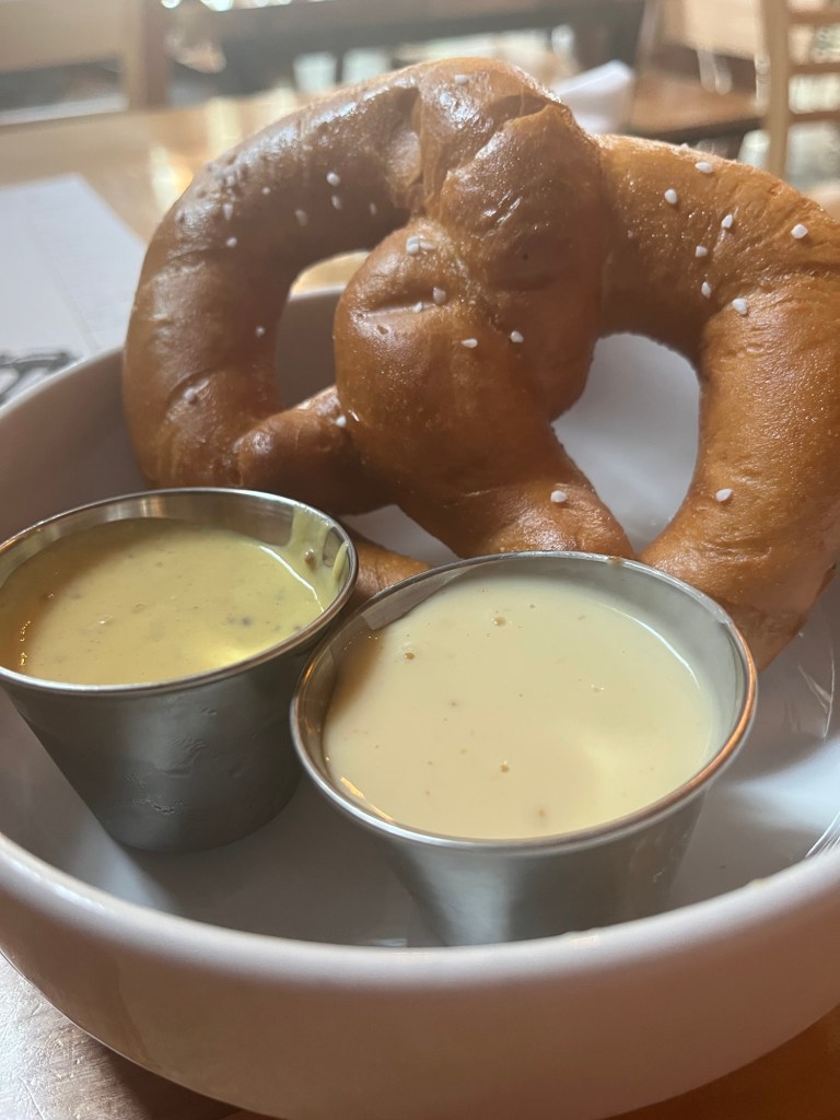 I started with a fresh-baked pretzel with mustard and beer cheese along with a flight of beer, which I ordered because several looked really good and I couldn’t make up my mind.