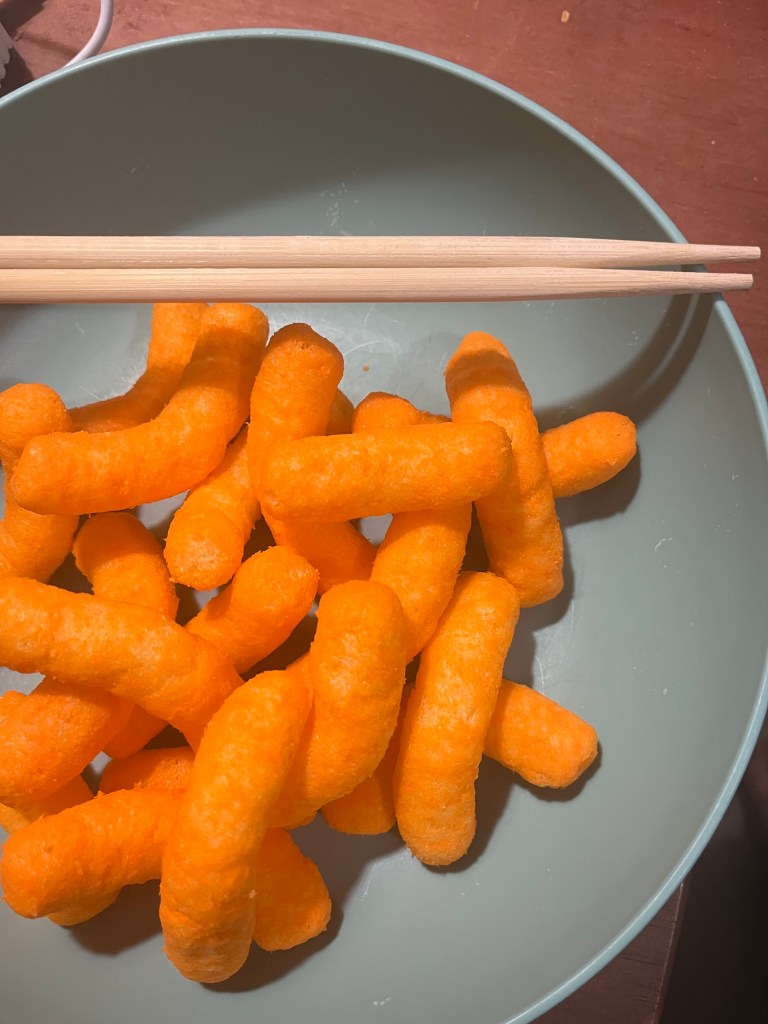 Last night I remembered I had the second bag, and recalled seeing someone say you could use chopsticks to eat them without getting the cheese dust everywhere (like on books and screens) and like the hot dogs, I am upset that I didn’t try this before because it worked so well.