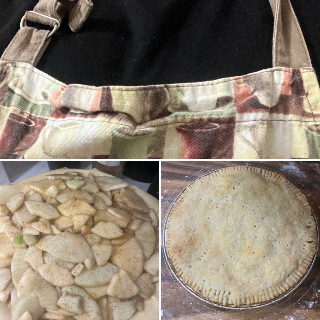 Specifically, I made my first apple pie of the season for our office Thanksgiving potluck. I put on my trusty apron (which I realized is fading but I am loath to get rid of it since we have such fond memories), sliced a variety of apples (three of them, one of which is Granny Smith), mixed them with all the spices that smell like Autumn should smell (six of them; the ratio remains my secret), and baked a pie I was extremely proud of – seriously, I have literally never had a pie go together this easy. I’ve made premade boxed dinners that were harder than this. I definitely crossed my fingers while it’s in the oven!