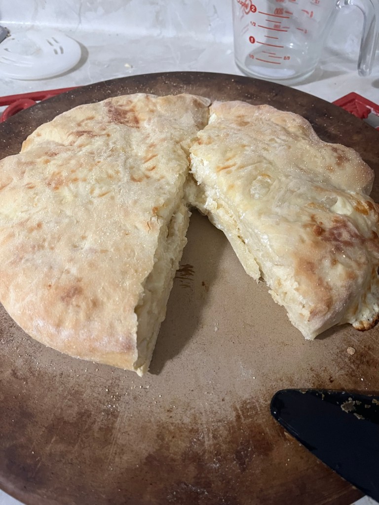 The cheesy bread didn’t turn out exactly as I had anticipated – it as supposed to be cheese filled, but I overfilled the pocket and ended up just kneading the cheese throughout the dough and baking it that way. It was still good!