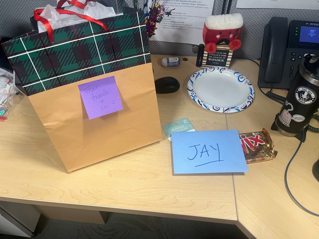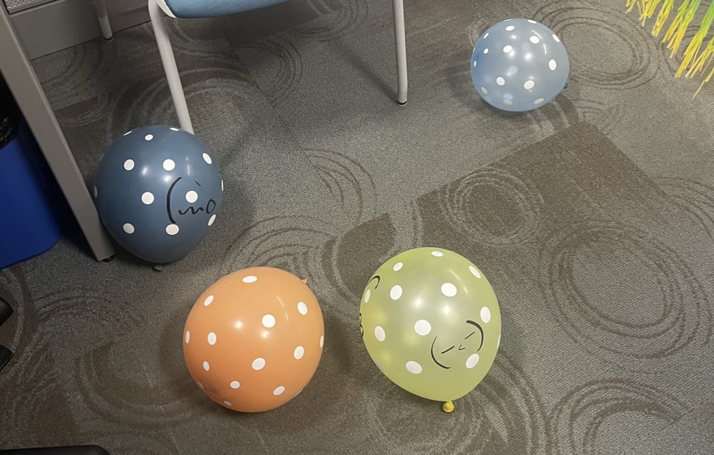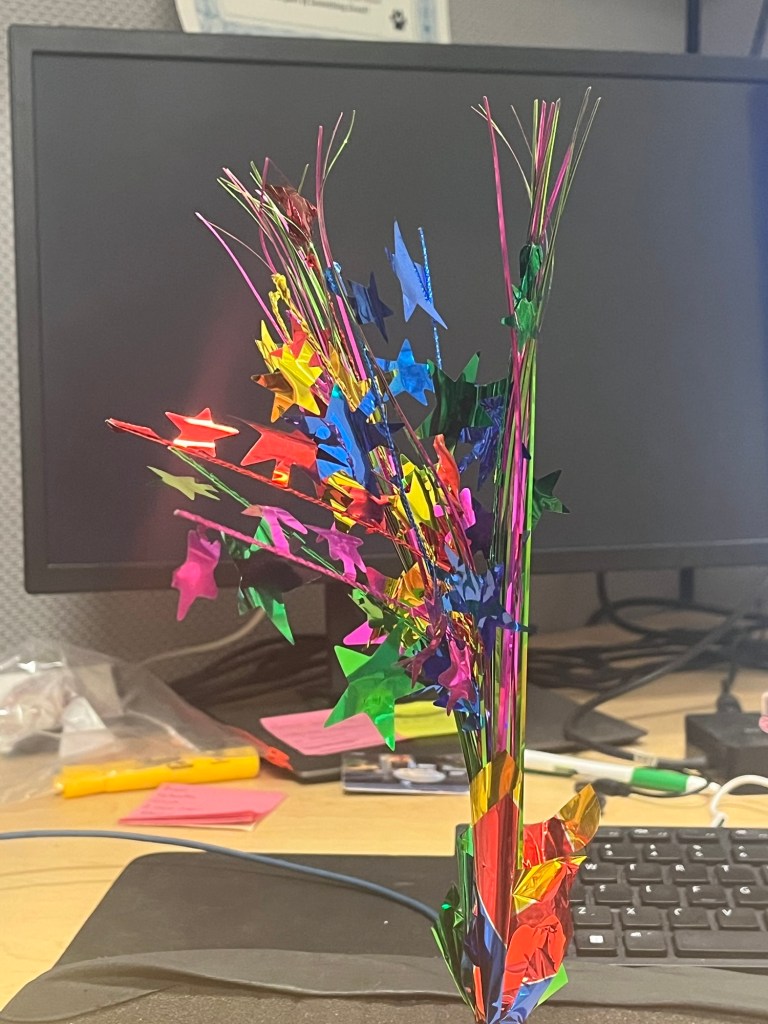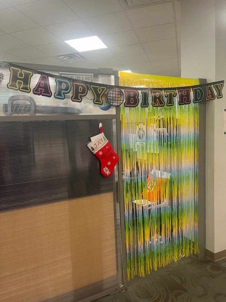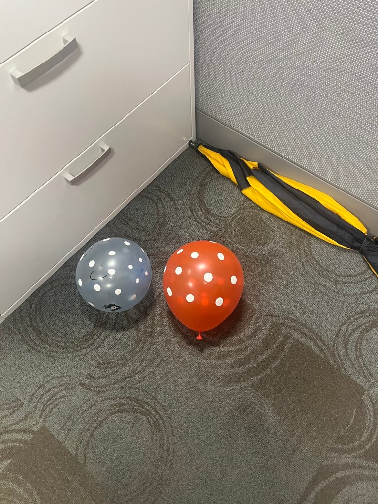 I had a morning meeting and when I got out they and others had collaborated to decorate my cubicle with a sign and streamers and balloons – there were cards and candy and a book and a Pusheen face mask and one colleague said today was all for me; and yes, it all made me cry.