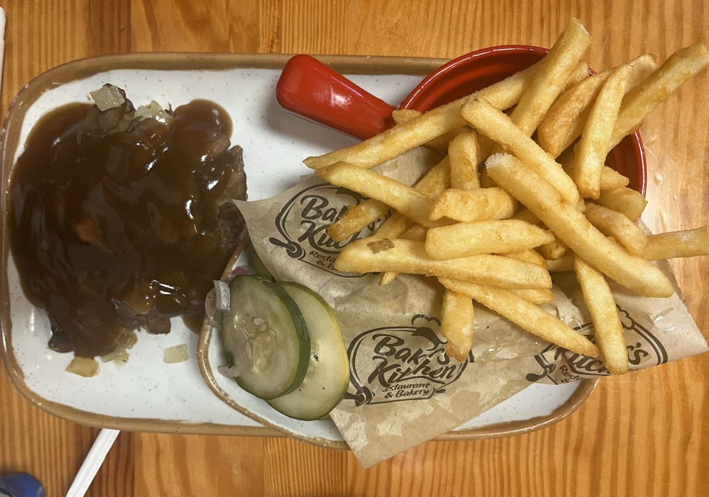 Krystal had biscuits and gravy and I had wanted a cinnamon roll with bacon and eggs but they were out of cinnamon rolls and so I had a hamburger steak with fries and cucumbers in vinegar instead and it was all very good.