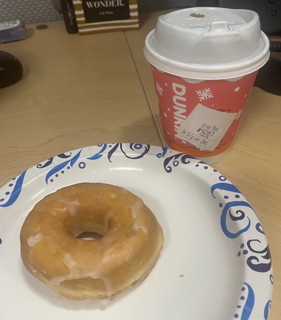 Monday I was well enough to be back at work. My mom called at exactly 7:15, as she has every December 22 since I moved away for my Birthday Phone Call. We couldnโt talk long since I did have to go to work, but when I got there I found one of my coworkers had bought me a donut and hot chocolate!