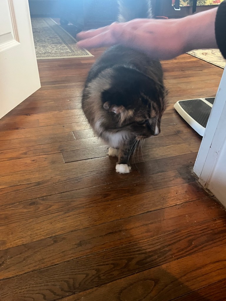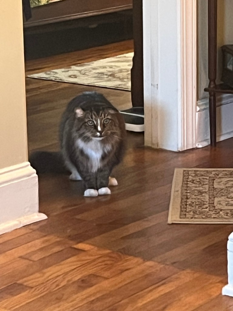 On Sunday the 14th we attended a Christmas party and there was a cat named Hank. I was told Hank was getting old and had tumors in his ears and was sociable but didnโt like crowds and so would likely stay in his room. And they were right: Hank stood in the doorway and watched people but did not come out. And that made me feel bad so I went and sat in the doorway and in about 2 minutes Iโd made a new friend!