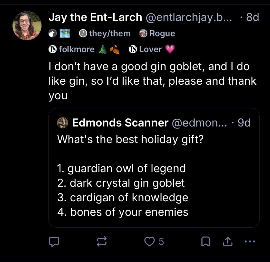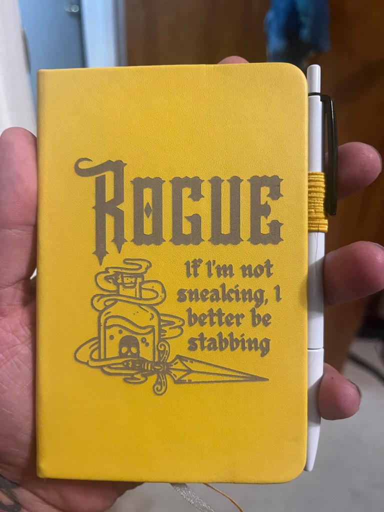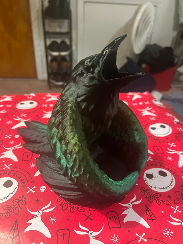 Other gifts included a D&D notebook from our friend Tasha and this gloriously amazing crow dice tower from Alex – and I know other packages are on the way, making for a wonderful time weโre calling Long Yule.