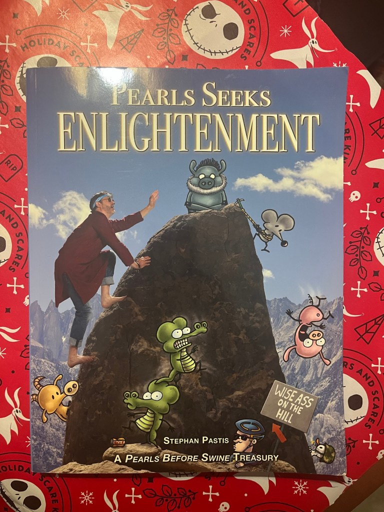 Our winter season begins with the first card or package and ends with the last card or package. So for us, Christmas began in October when my brother Leroy and his wife Julia sent us water bottles for Christmas, sending them early because they found Halloween-themed bottles they knew weโd like: frogs for Krystal and witchy cats for me. Since Thanksgiving my nephew Andrew sent me a Pusheen day-by-day calendar and my mom sent me a Pusheen wall calendar that I put up in my cubicle before leaving for winter break. A coworker gave a a small insulated Christmas cup filled with chocolate. My sister Andrea sent me the Twin Peaks TV series dvds and my brother Chris sent me two books: Pearls Seeks Enlightenment and The Dance of the Serpents.