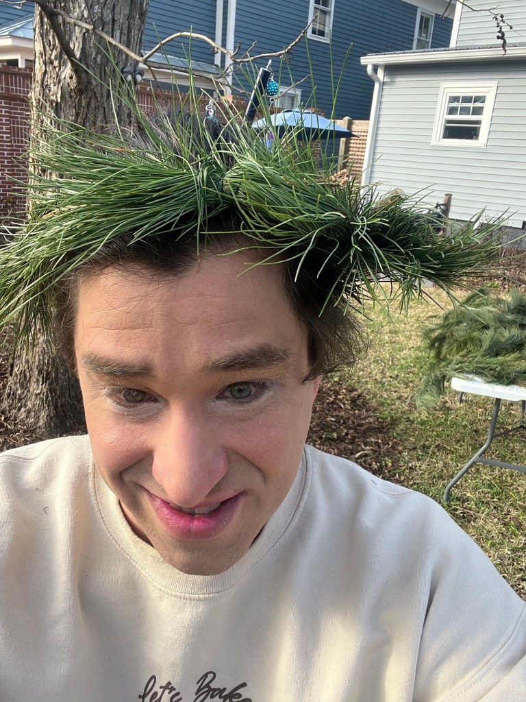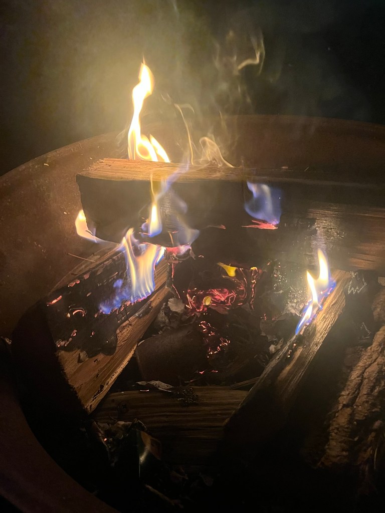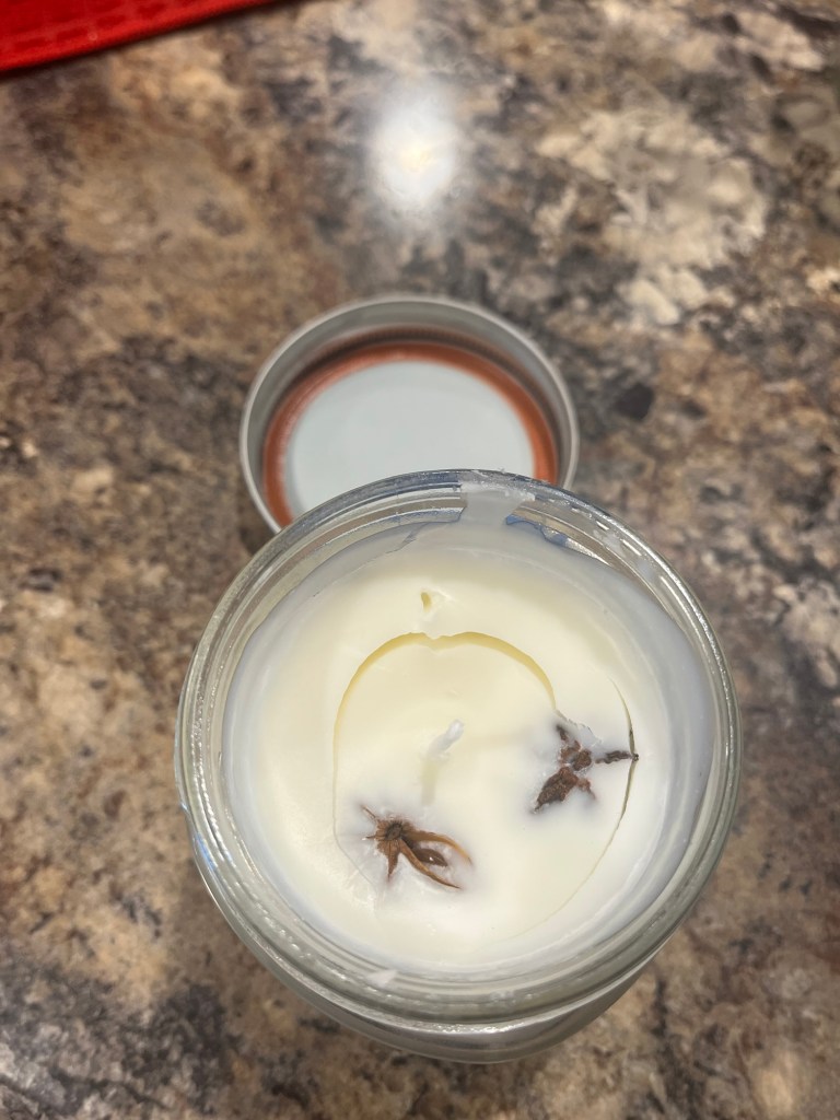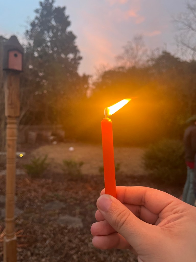 I felt well enough to do a little grocery shopping on Saturday, then conserved my strength for a Yule party on Sunday Iโd been looking forward to for months. I stayed mainly outdoors, though I did go inside to refill my cup and plate and to make a candle with bergamot, peppermint, and whole star anise. Outside I talked and chatted and made a Yuletide crown and when the sun went down the host handed out candles. I lit mine from the fire and others lit theirs from mine and so on and then made ten or fifteen minutes later I realized that every candle lit came back to the one I lit on the fire and that made me feel a special kind of way.