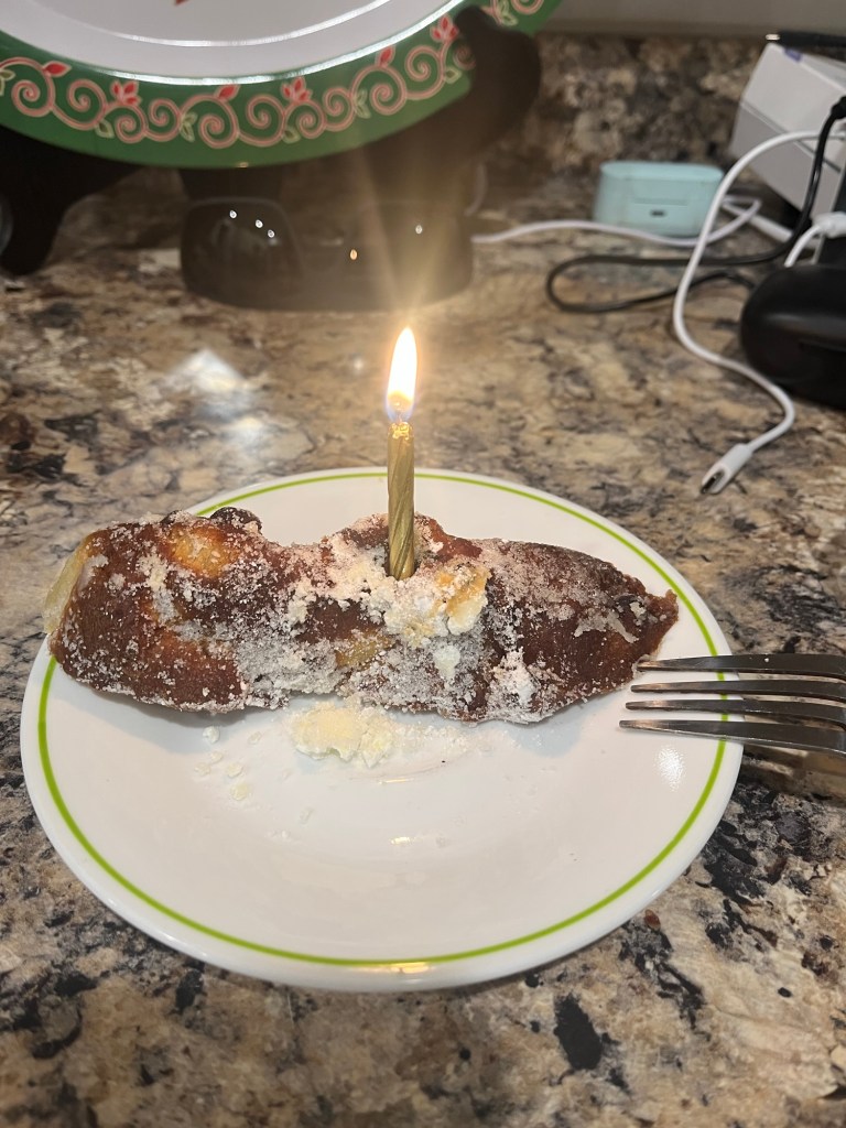 When we got home Krystal gave me a card and a gift and then I had to go to my in-lawsโ where Iโm still currently watching some furry friends. We found MST3K on Tubi and I put a birthday candle in a slice of Stollen and all through the day I got birthday notifications across all types of social media, making it a glorious birthday indeed.