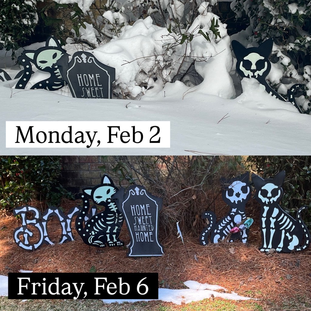 You can see pictures of the snow in my post from last week, but here’s a comparison of where we were on Monday compared to Friday: