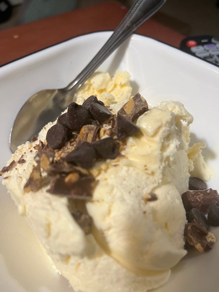 And now I’m enjoying some chocolate-topped ice cream and elderflower tonic water before bed: