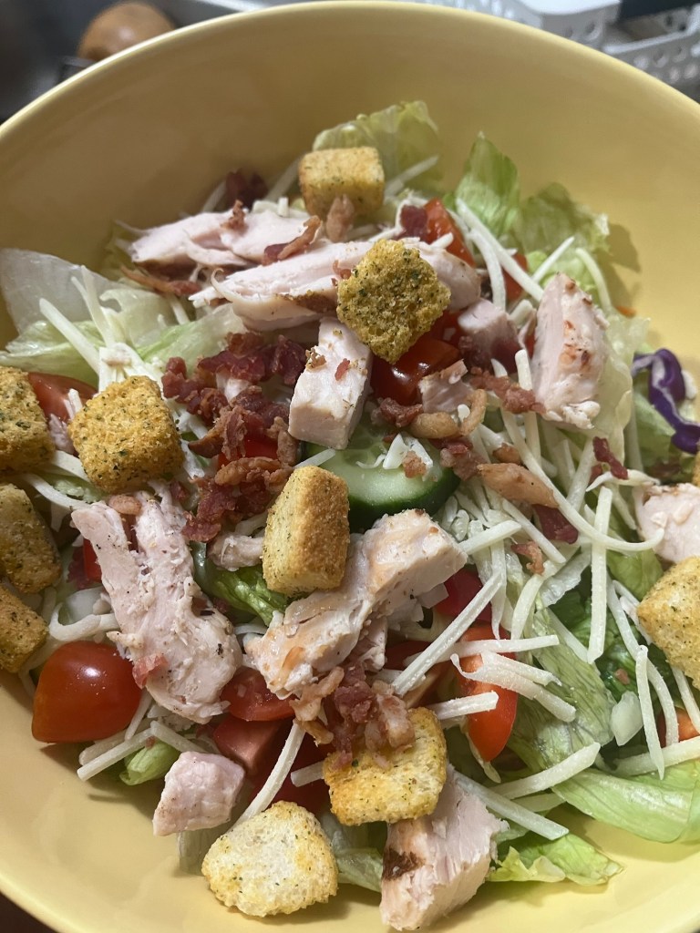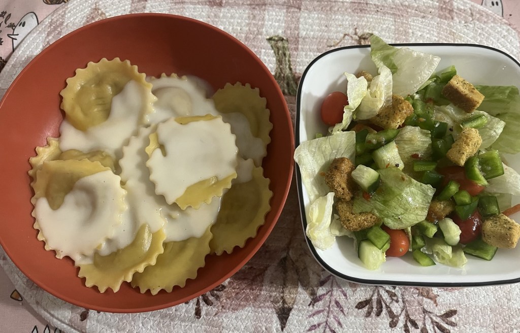 Somewhere along the line I made mushroom ravioli and got really into salads – specifically salads made of various lettuces with carrots, cucumber, tomatoes, onions, red peppers, chicken, croutons, Swiss & Gruyère shredded cheese, crumbled bacon, and Italian dressing.