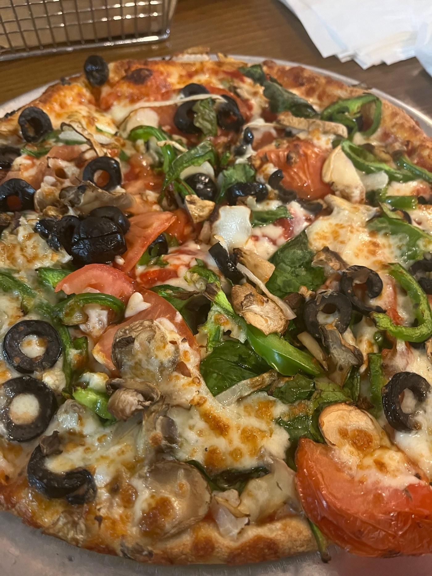 Friday was a short work day and a good start to the weekend when we went out to eat with my wife’s parents and her sister and her sister’s husband. I had a veggie pizza that came with cheese, mushrooms, onions, peppers, black olives, garlic, tomatoes, and spinach.